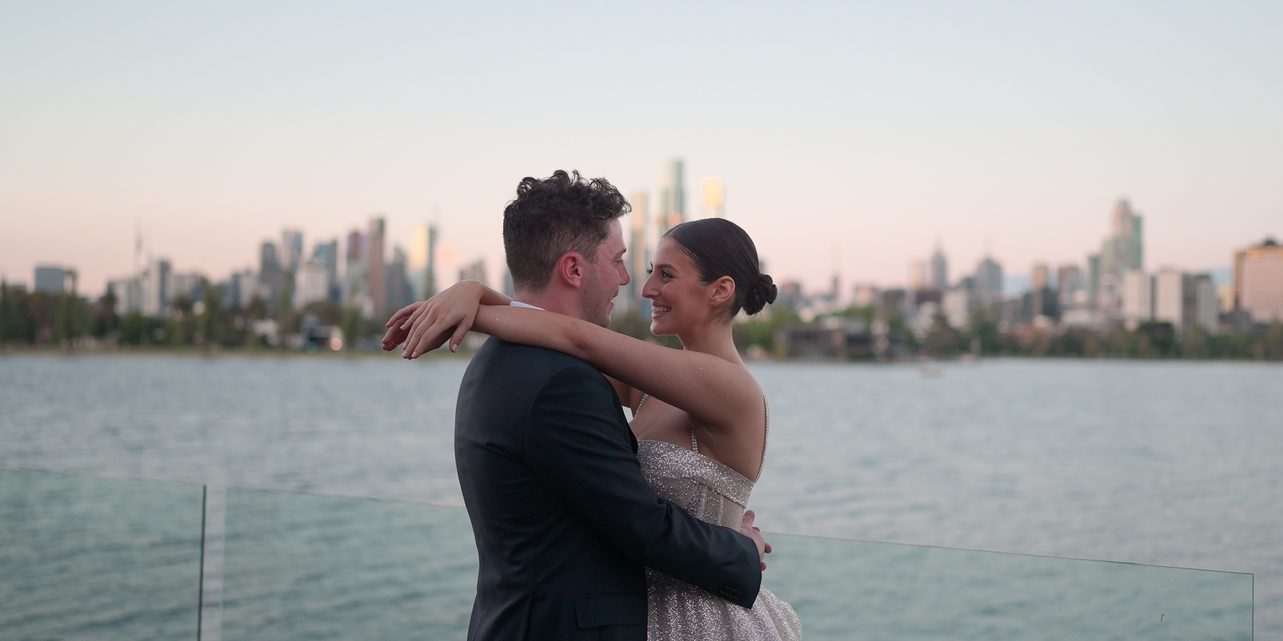 "Samantha and David's wedding at Carousel Albert Park was a magical blend of tradition, love, and stunning views. As they walked down the aisle, their best friends serenaded them with heartfelt songs, creating a beautiful atmosphere against the backdrop of the Melbourne city skyline and tranquil waters of Albert Park Lake."